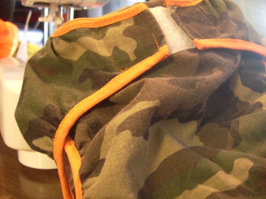 They are PUL (polyurethane laminate coated fabric) lined cotton prints bound in FOE (fold over elastic) with touchtape closures. I made three in a medium/large size from a pattern I drafted just for him. The prints are camoflage with orange FOE, dragon/flames with blue FOE and jolly roger pirates with red FOE (not shown in pics). The fit is great and they cover everything from premium prefolds to fitteds!