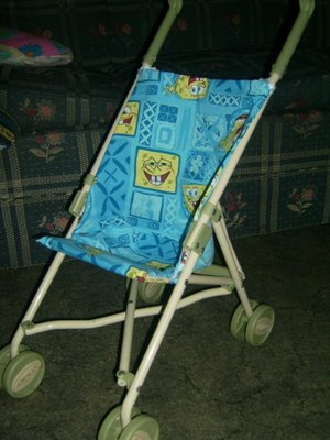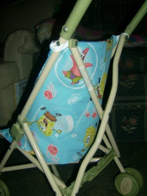 I traced out the 3 pieces of the ripped stroller seat onto 2 different Spongebob fabrics and whipped up a reversable seat that is not only cute and functional, but a bit stronger .. which is apparently needed in this house.. haha