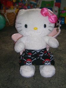 I had been rolling around the idea of making doll clothes for a while and got my opportunity a few days ago while finishing up one of the summer skirts I’ve been pumping out for Wills. She checked it out as I finished and promptly said, “I want Kitty to have one too”. So I pulled the fabric I was working with back out and whipped one up.