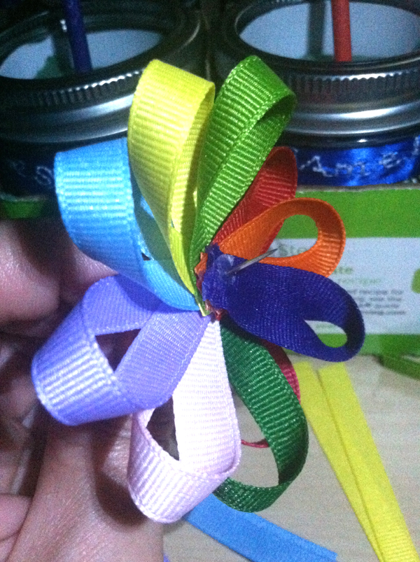 Then I hot glued them onto a small barrette and clipped them to the colored dowels.