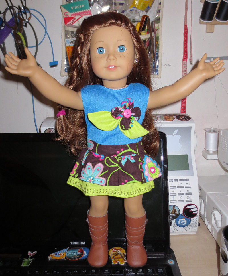 The skirt itself is a perfect fit and I will be making more in some less awful fabric combinations. I mean, I love that brown print but its too big for doll stuff and looks pukey with that green.