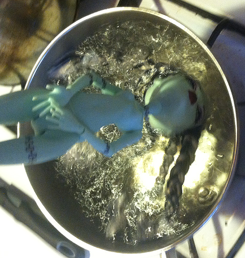 Someone happily chopped off the front of her hairline and I finished the job by trimming it all the way down to the scalp and then pushing the rest back through the root holes with a straight pin, effectively giving her a new hairline! After washing her up and combing the rest of her hair I decided she needed a perm. I wanted some nice crimped waves and settled on seeing what braiding would produce. I wrapped the ends of the braids with pipe cleaners instead of elastics because most elastics will melt right into the hair in boiling water.