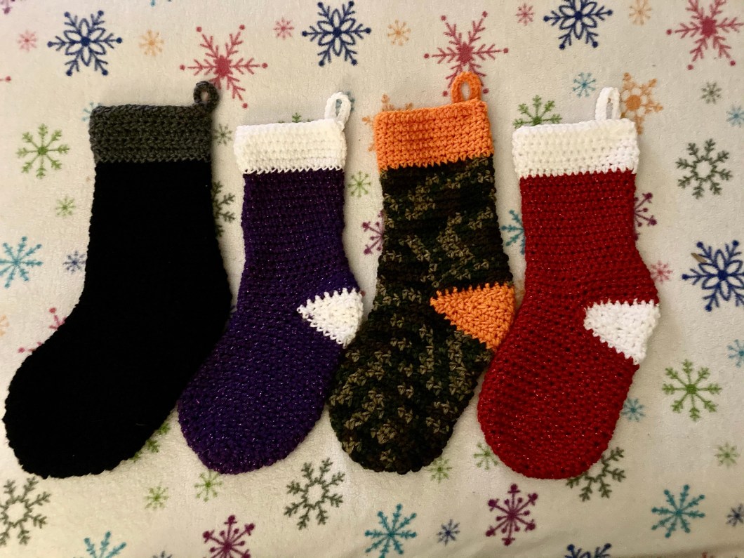 I should preface this by saying, I made 6 of these things and didn’t start writing down the pattern until #4, which is the camo/orange one above. I started working on them about 2 weeks before Christmas in between the crazy holiday work schedule, virtual schooling x4, and sleep. I’m positive I was actually sleeping while making the last one – which is mine so it doesn’t matter (the egg shaped teal/white one on the right end of the mantle). Despite the wonkiness of some and the fact that I perfected the pattern in the process, we are keeping them all.
