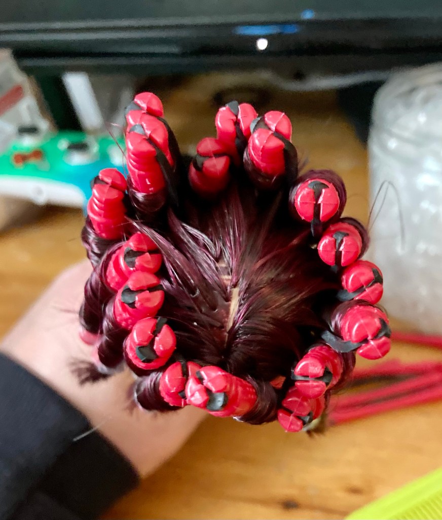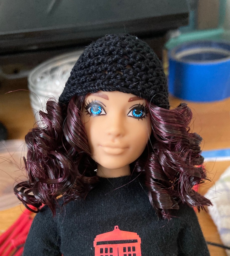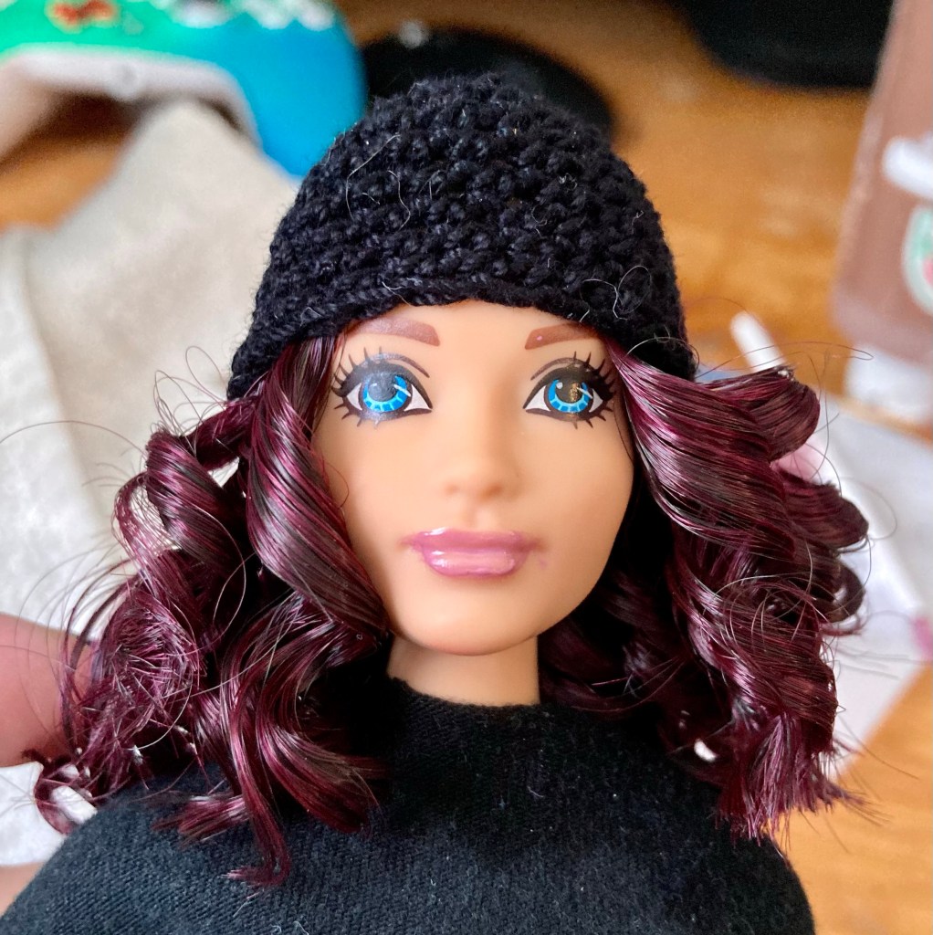 I have had this curvy Fashionista #38 since she came out. This was the first curvy Barbie that I got and I instantly labeled her my mini-me. Blue eyes, purple hair.. chunky. Yes please.I knew eventually they would come out with a curvy m2m body, and that I would just curl the hair and repaint the lips. Well the body I finally replaced last year and called it a day. But today, upon inspecting this poor girl I found serious glue seepage! After several boil washes with oxyclean, rinsing and combing, and plucking crusty floppy glue out of her head.. I finally completed this dolls long awaited transformation!After removing the lipstick with some acitone, I rolled the hair with some Annie’s short red perm rods. As you can see, instead of rolling with papers I use clear elastics to secure the hair to the rod.. I find this gives me more control in getting the curls perfectly positioned. I had planned on cutting the hair anyway so it was easy to snip the ends right above the elastics.I positioned the rollers halo-like with the curls all going in the same direction, which is similar to my own curl pattern.Then its 2 10 second dips in just boiled water, and 15 second rinse in cold tap water and we can remove rollers and snip ends.I really could not have had a better outcome. When I bother to style my curls, this is so similar to how they come out!And of course the lips were repainted a softer more neutral and sheer color. This was achieved by mixing a drop of shiny varnish with a drop or brown and violet acrylic paints till I got the color I wanted. Then add a drop of rubbing alcohol to really thin it out and it goes on just like lip gloss, dries super fast, and contains its own protective finish. Of course, now I need to design some new clothes.. maybe a gta tee 🤣